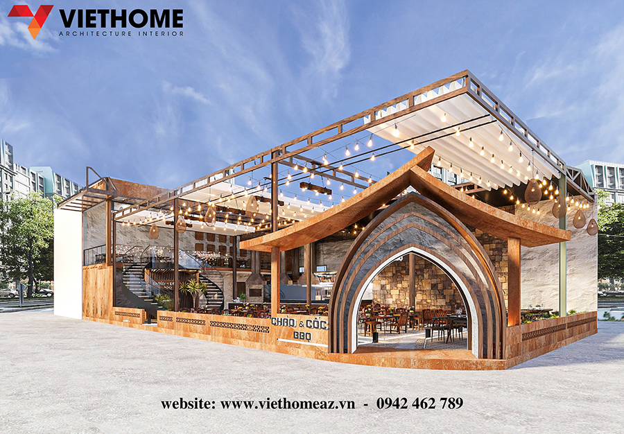 Sử dụng vật liệu tự nhiên như tre, gỗ, đá… kết hợp cây xanh giúp nhà hàng gần gũi với môi trường, đồng thời tiết kiệm năng lượng. Những không gian “xanh” không chỉ hợp xu hướng mà còn ghi điểm với nhóm khách trẻ yêu thích lối sống bền vững.