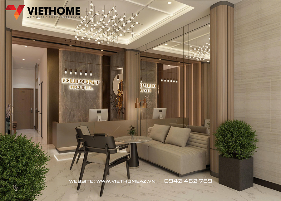 Nội thất khách sạn khu vực chờ bao gồm ghế sofa, bàn decor và các loại đèn trần độc đáo để tạo điểm nhấn nghệ thuật.